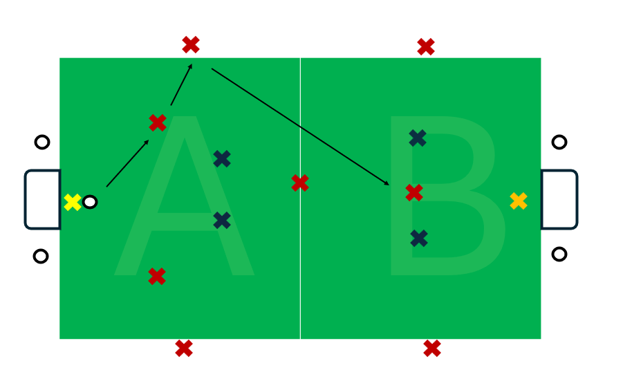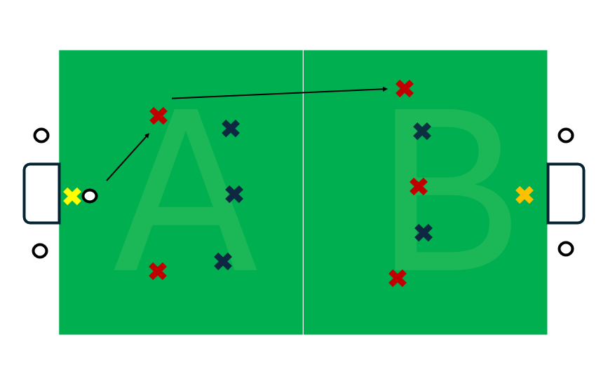 In this example red are 2v3 plus their goalkeeper in zone A. In zone B red have the overload, three reds vs two blues plus their goalkeeper. Reds will need to get the ball forward quickly to capitalise on their overload.