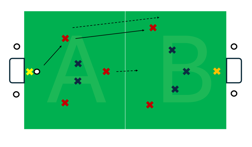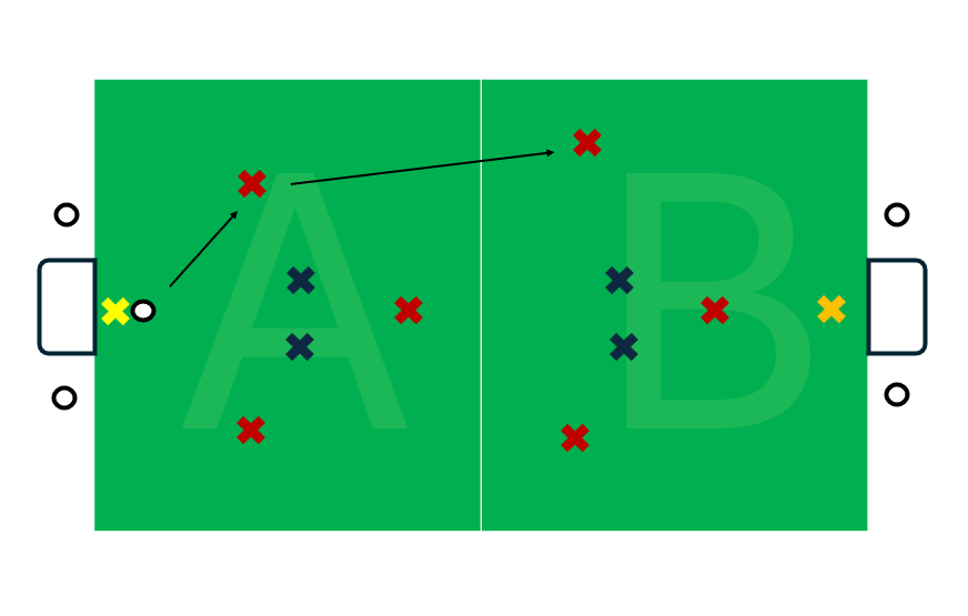 In this example the pitch is divided into two (zone A and zone B). The reds have a 3v2 plus their goalkeeper in zone A and a 3v2 plus the blue goalkeeper in zone B. Reds aim to get the ball from zone A into zone B to try to score. All players are locked in their zones, except for if blue gain possession, then all blues can attack. In this version reds are encouraged to pass the ball from zone A to zone B, with the aim to develop forward passing.